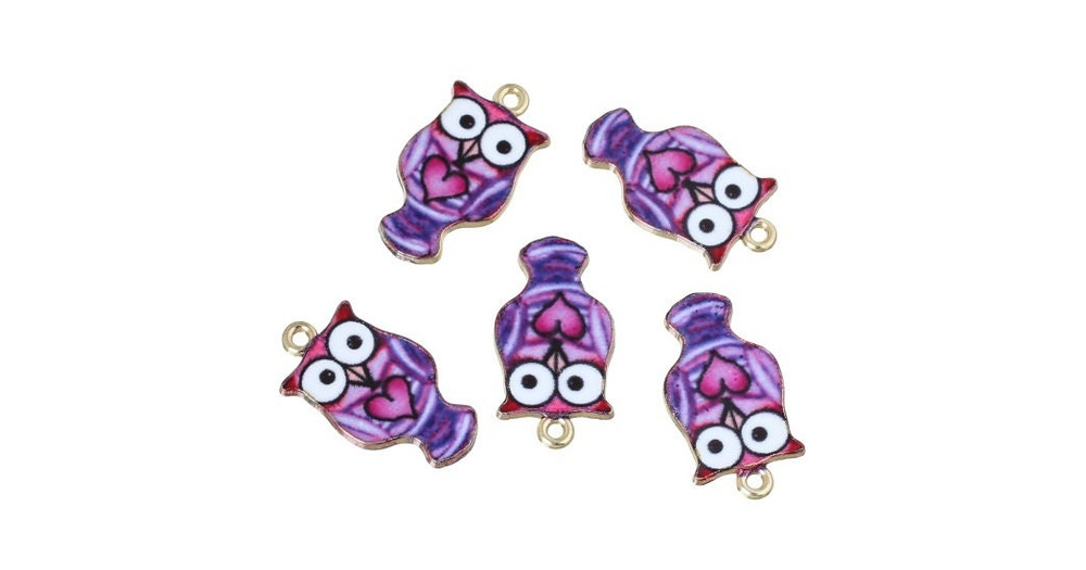 Purple Enamel Owl Charm: Pink Heart Bird Pendant