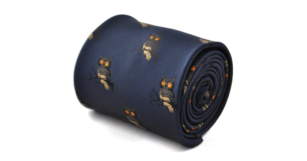 Navy tie with owl design with signature floral design to the rear by Frederick Thomas FT1794
