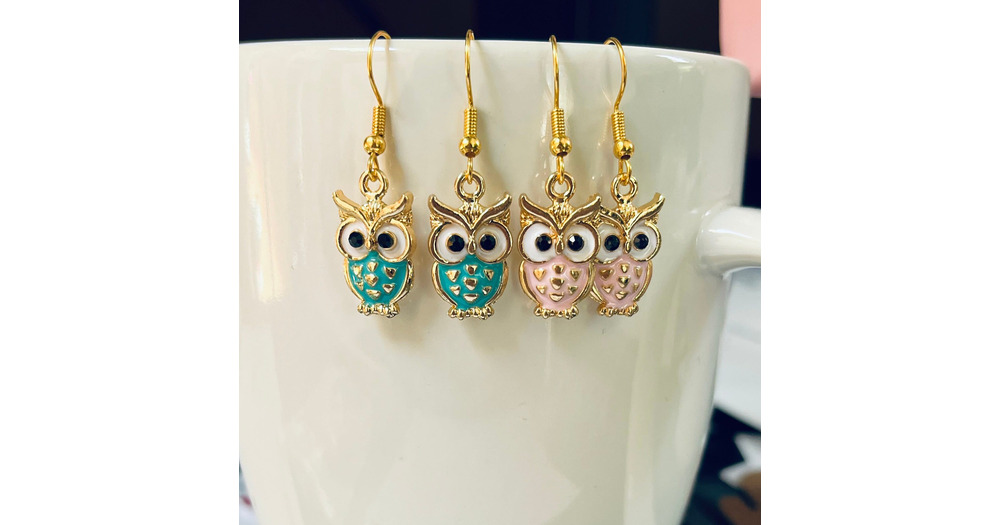 Handmade Gold-Plated Owl Earrings: Whimsical Animal Jewelry,Pink & Teal Enamel Owl Earrings, Cut