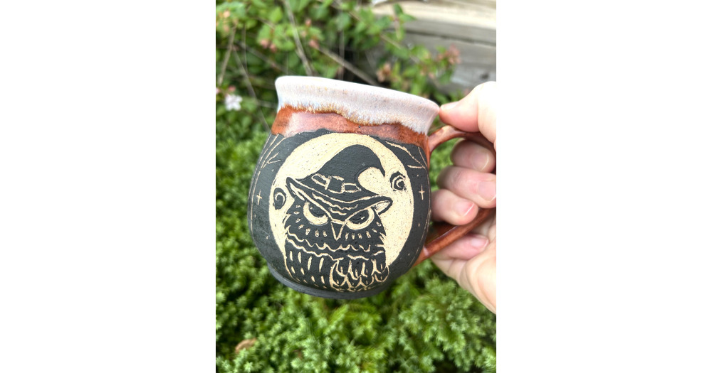 Hand Carved Owl Mug: Sgraffito Pottery, Autumn Colors, Halloween Coffee Mug