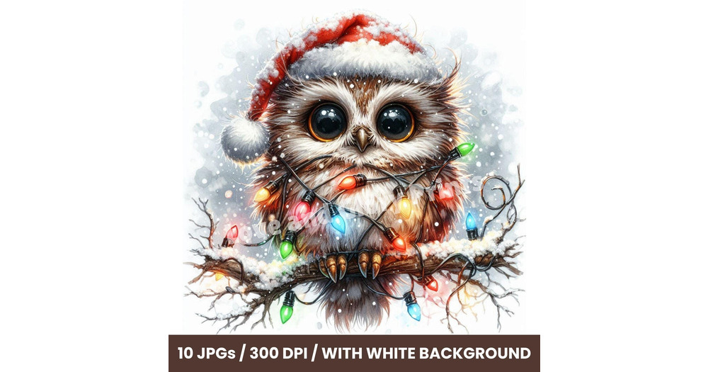 Quirky Christmas Owl Clipart Set of 10 JPGs Christmas Animal Clipart, Printable Watercolor Clipart,