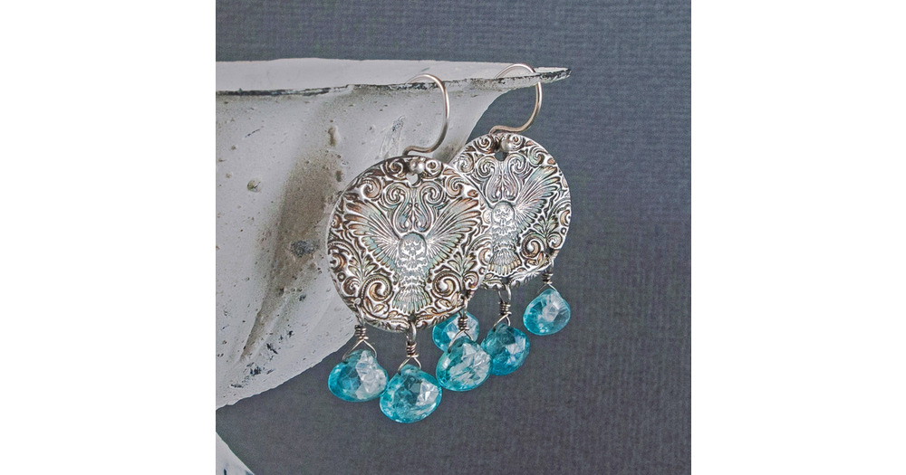 Sterling Silver Owl Earrings: Blue Zircon Chandelier, Artisan Jewelry