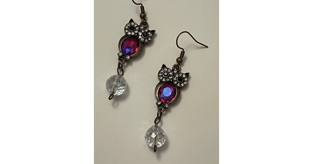 Iridescent RHINESTONE OWL Dangle EARRINGS Nickel Free Hooks 2.5" Long Beautiful Glass Beads Bra