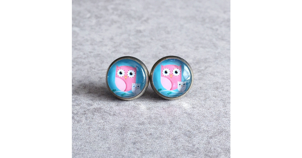 30% OFF: Owl Earrings - Pink and Blue Glass Cabochons, 12mm Silver Plated Bezel Trays, Stud Posts, W