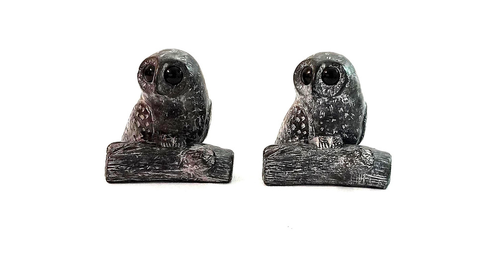 6.5 cm Two Small Owl Figurines on Soapstone Log by The Wolf Original. Made in Canada. Collectible.