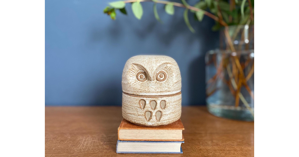 Vintage Ceramic Owl Trinket Box: Brown Speckled Storage Jar