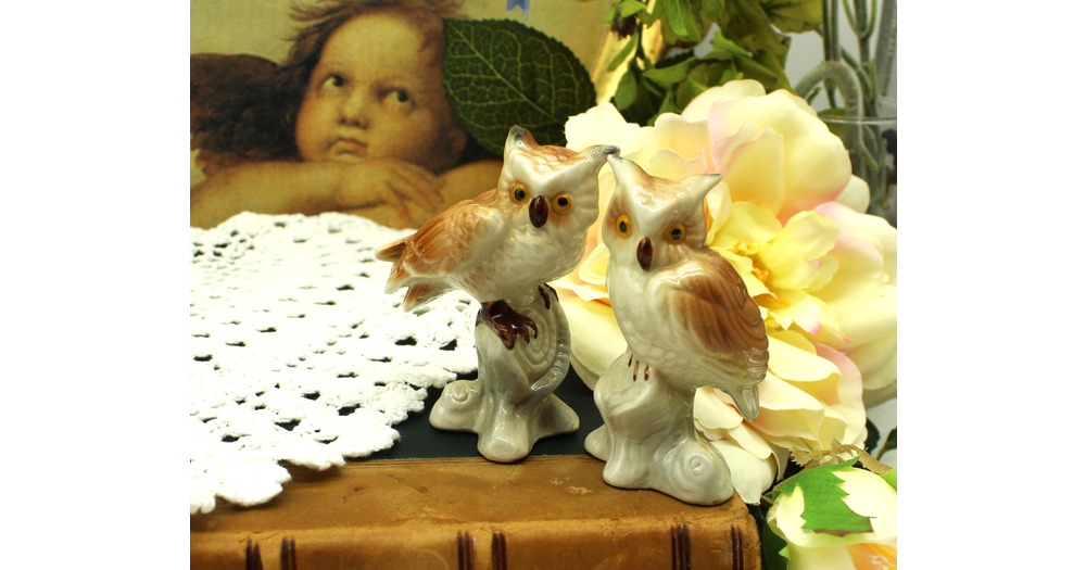 Cute Ceramic Pair Mini Owl Figures- Eagle Owl, Horned Owl Ceramic Owl Duo. Possibly made in Japan. c