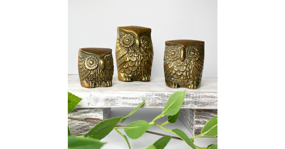 Set of Three Vintage Solid Brass Owls, Collectible brass animal figurines, MCM home accent decor
