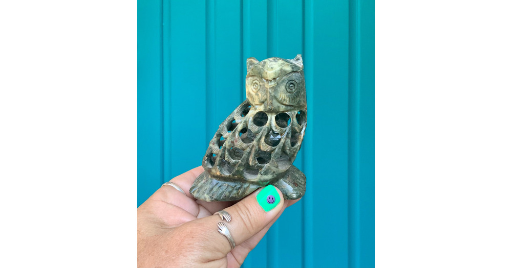 FREE SHIPPING-Vintage Hand Carved Green Soapstone Owl in a Owl Figurine-Hippie-Bohemian-Nature Decor