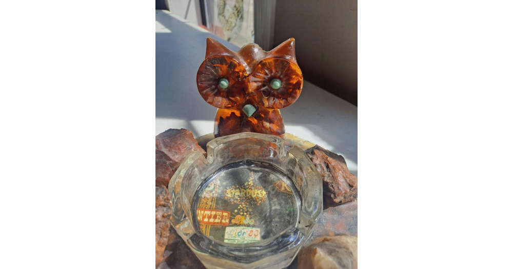 Las Vegas Souvenir Owl Lucite & Petrified Wood w/ Glass Ashtray Insert On Tray