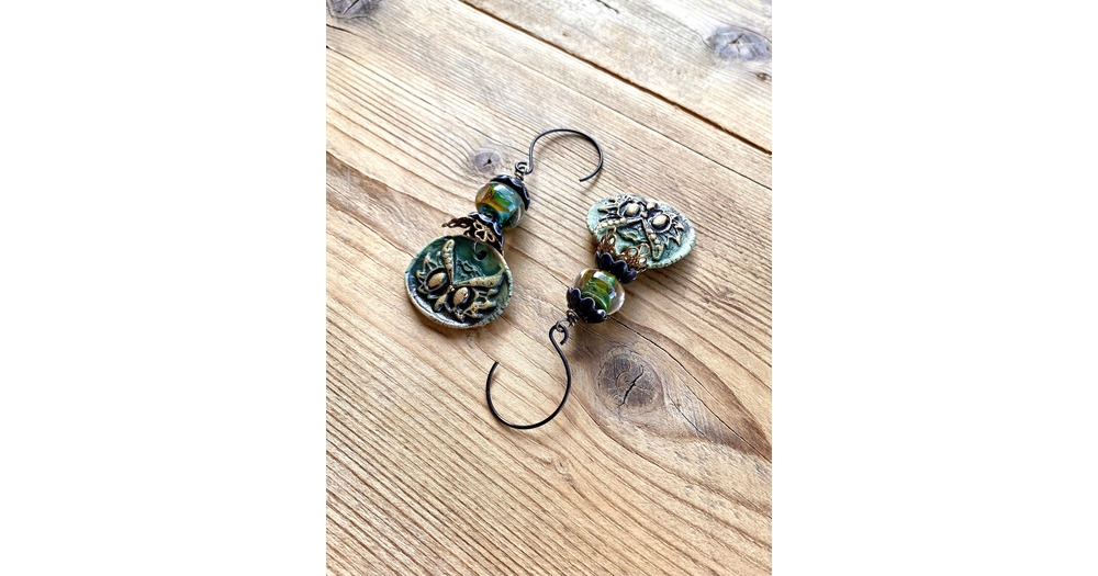 Owl earrings, green earrings, OOAK, boho bohemian earrings, big little bird, artisan glass earrings,