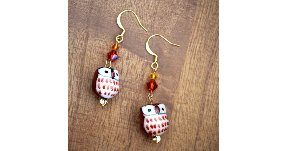 Ceramic Owl Earrings: Fall Colors, Crystal Drops
