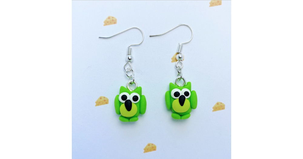 Handmade Green Clay Owl Earrings: Silver Fishhook Jewelry