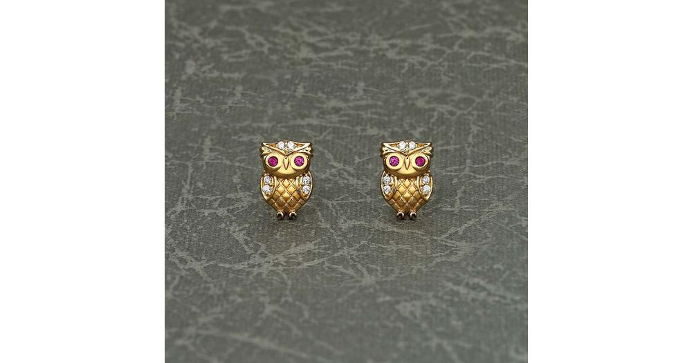 Gold Plated 925 Sterling Silver Owl Earrings with Cubic Zirconia For Women,Small Gold Owl Stud Earri