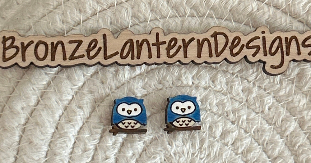 Owl Lover: Laser Cut Owl on a Branch Studs Hand Painted with Blue Acrylic