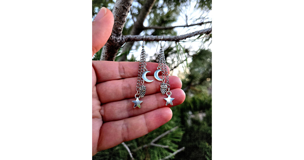 Sterling Silver Night Owl Dangle Earrings: Celestial Star Moon Charms
