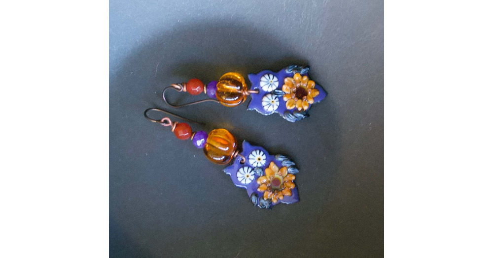 Purple Owl Earrings, Artisan Enamel Earrings, Whimsical Sunflower Earrings, Floral Earrings, Bird Lo