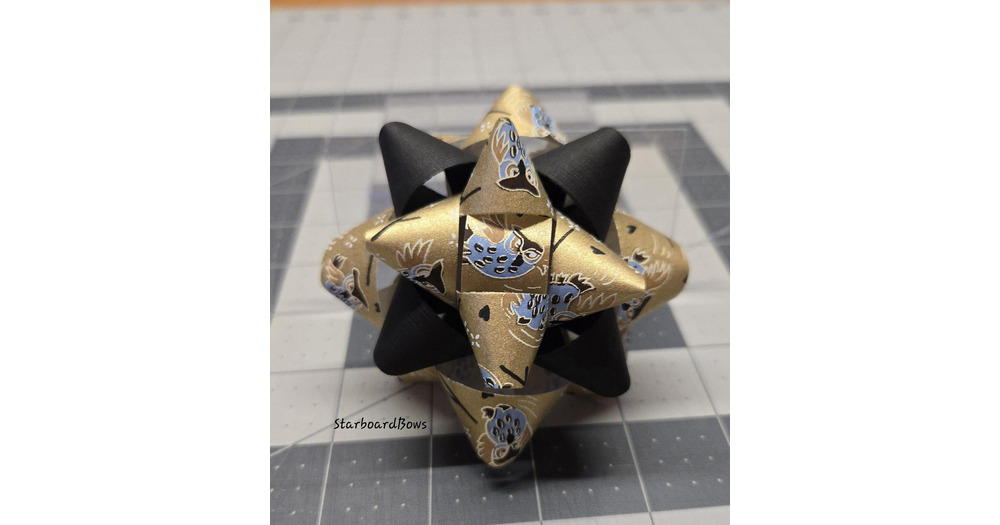 Gift bow - Gold, blue and brown owl Chiyogami and black linen handmade paper gift bow