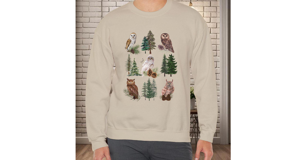 Woodland Owls Sweatshirt, Nature Lover Gift, Cottagecore sweater, Evergreen Trees Art, Unisex Pullov