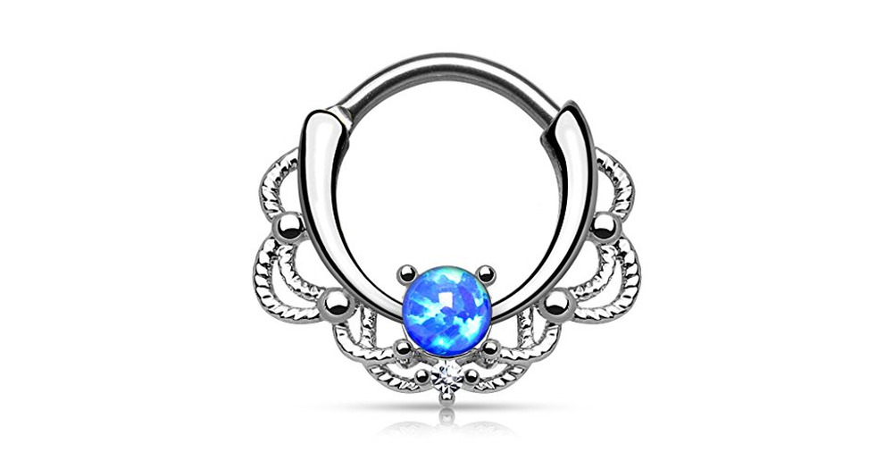 Pierced Owl 16GA Stainless Steel Lacey Synthetic Single Opal Septum Clicker Ring (Blue)