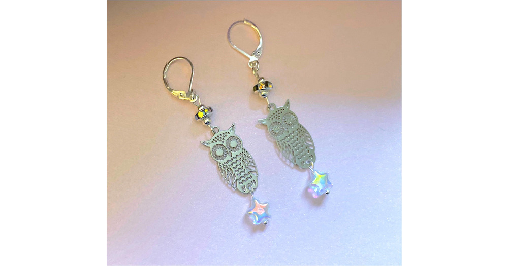 Silver Owl earrings with rhinestone rondelles and glass star/Birthday gifts for her