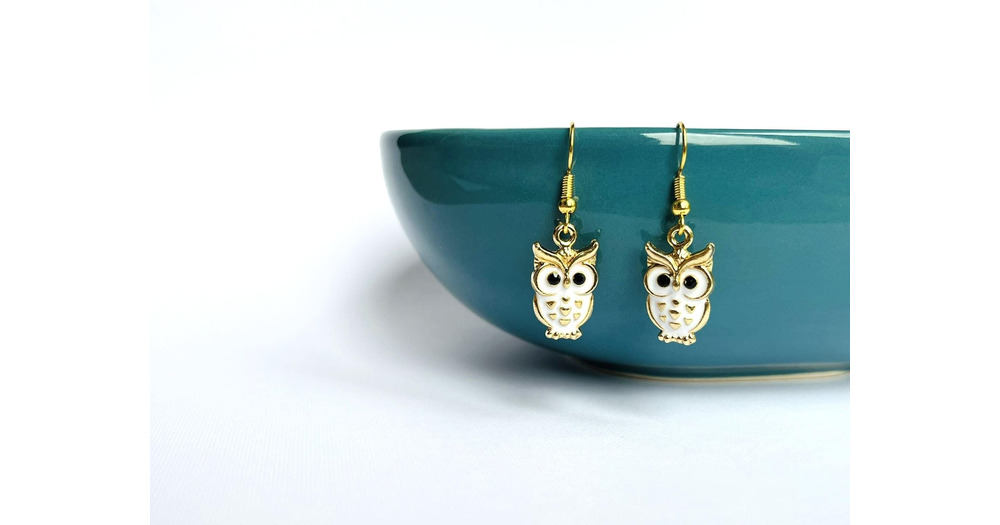 Owl Earrings - Enamel, Gold Plated, White, Bird, Animal, Gift, Jewellery.