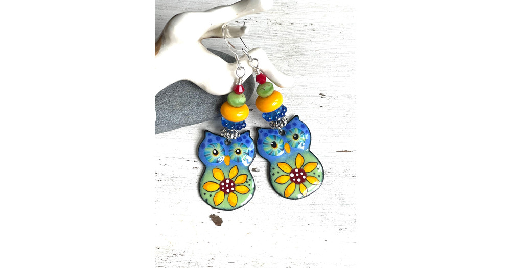 Artisan Enameled Owl Earrings: Sterling Silver Boho Flower Owls