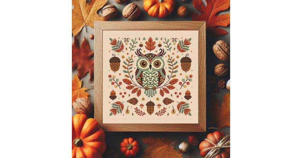 Owl cross stitch pattern Autumn sampler Fall cross stitch quaker Primitive Forest Bird embroidery Ac