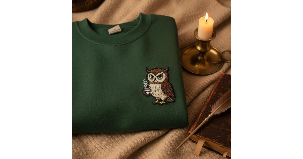 Grumpy Owl with Coffee Embroidered Sweatshirt, Cottagecore Bird Hoodie, Librarian Academia Gift, Boo