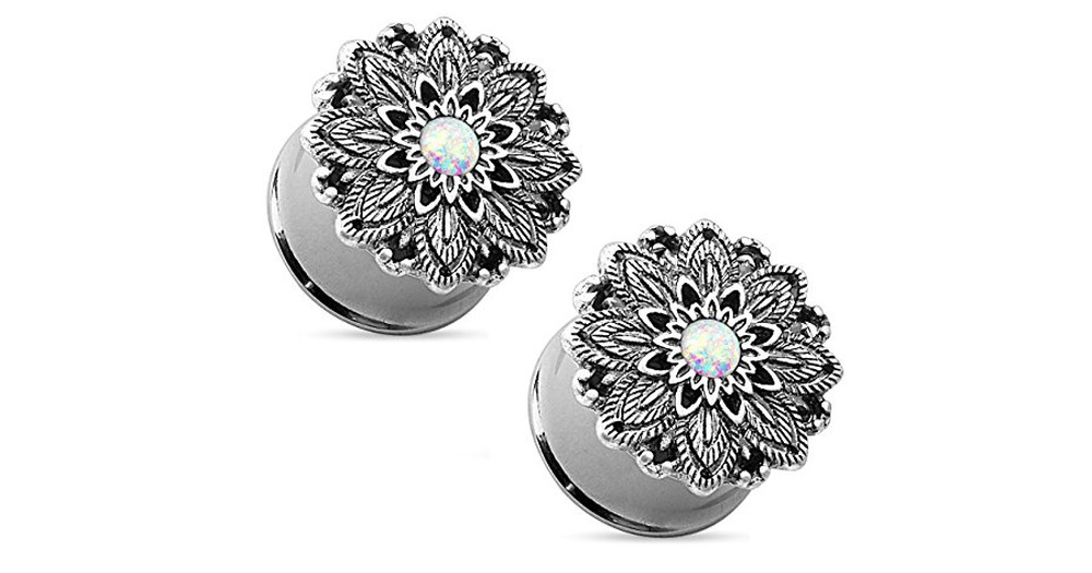 Pierced Owl Antique Silver Plated Stainless Steel Opal Centered Lotus Flower Top Double Flared Plug