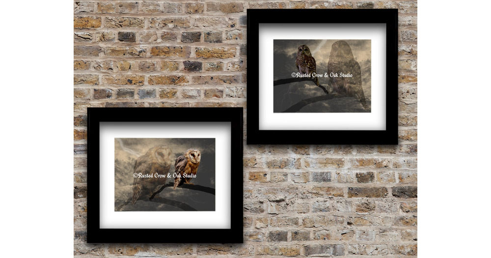 Set of 2 Art Prints Rustic Owl Double Exposure Country Art Matted Picture A320