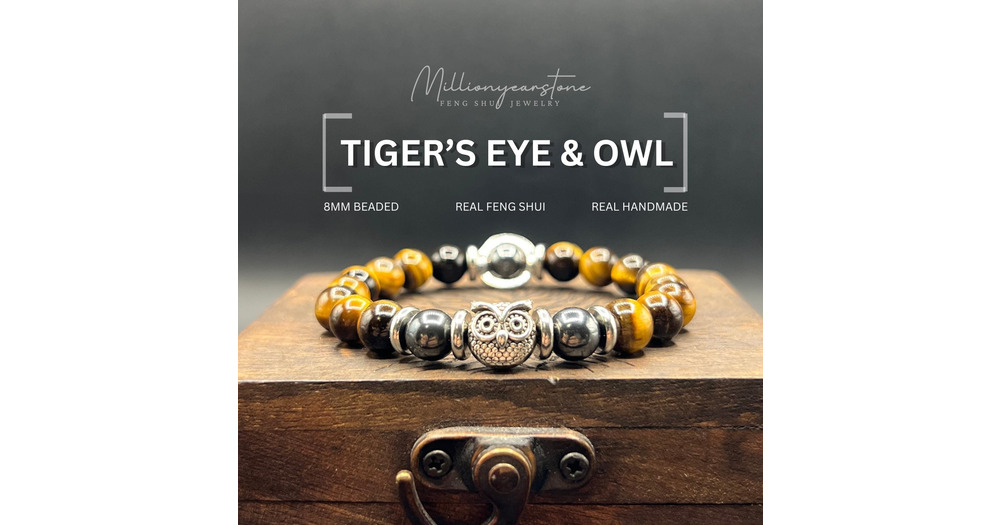 Tiger Eye & Hematite Beaded Bracelet: Silver Owl Charm, Feng Shui Jewelry, 8mm natural gemstone