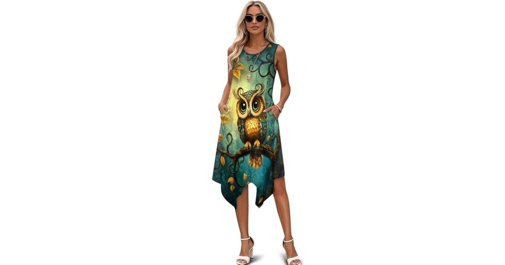Flaishyardaw Green Owl Midi Dresses for Women 2025 Plus Size 4th of July Summer Dresses Loose Sleeve