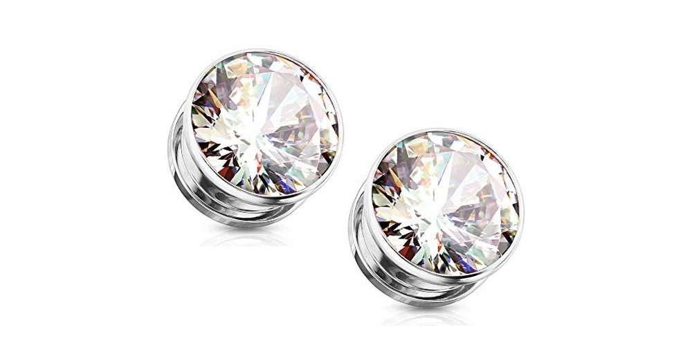 Pierced Owl Stainless Steel Bezel Set Clear Gem Screw Fit Plug Gauges, Sold As Pair (Silver Tone, 5m