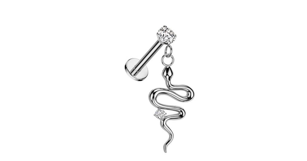 Pierced Owl 16GA 316L Stainless Steel CZ Crystal with Dangling Snake Flat Back Stud (Silver Tone)