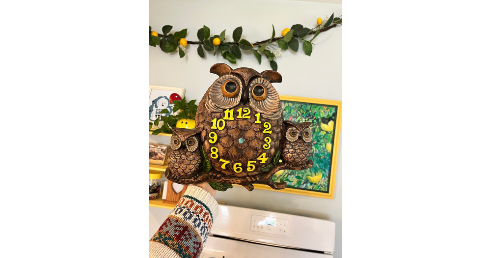 Vintage Arnel’s 1970s Hand Painted Ceramic Owl Wall Clock
