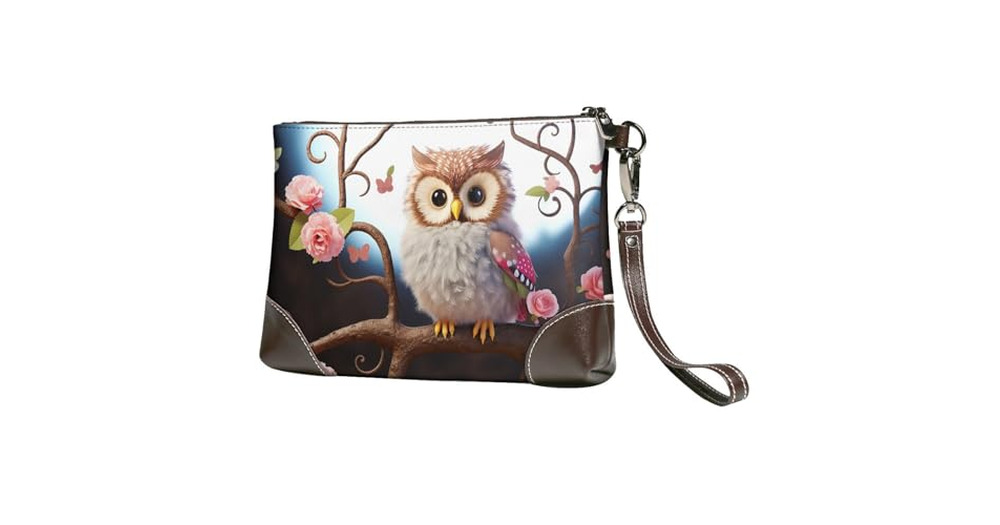 Women's Leather Wristlet Purses Clutch Wallet Cute Owl Tree Flowers and Squirrel Handbag Ladies