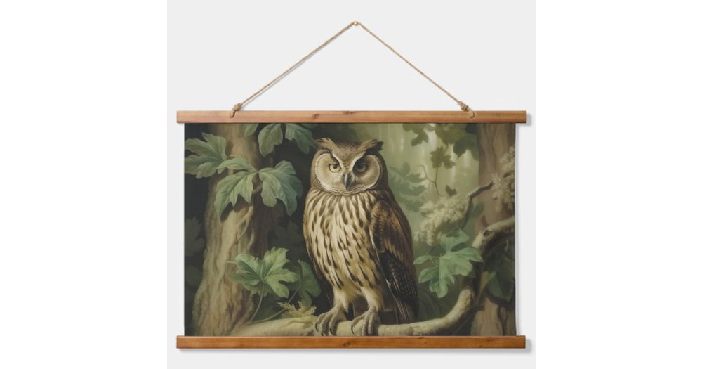 Vintage Style Owl in Enchanted Forest Hanging Tapestry