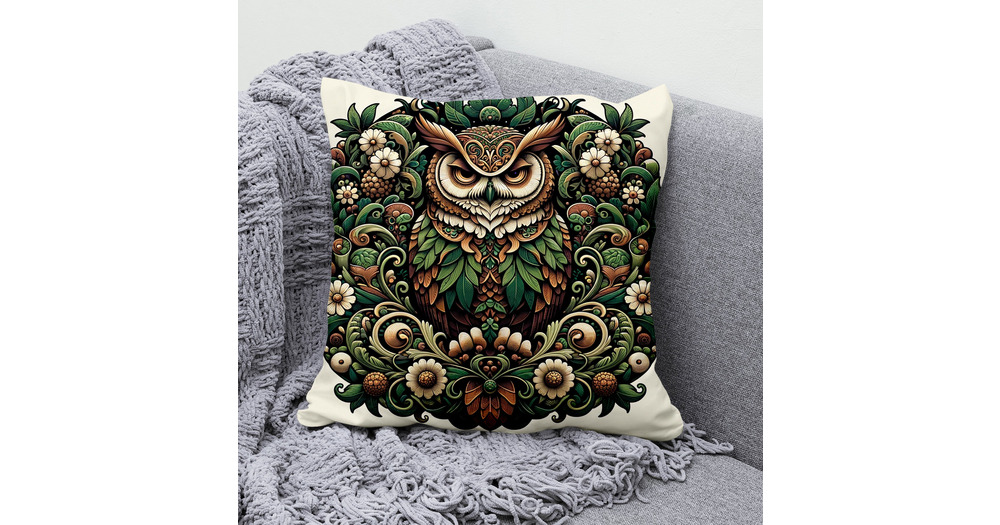 Intricate Owl Throw Cushion Cover, Cotton Linen Pillow Cover, Square Cushion Case with Green Accents