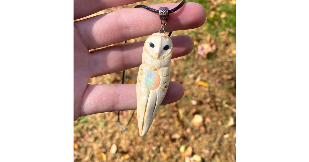 Ivory Clay Barn Owl Pendant: Natural Opal Boho Handmade Necklace