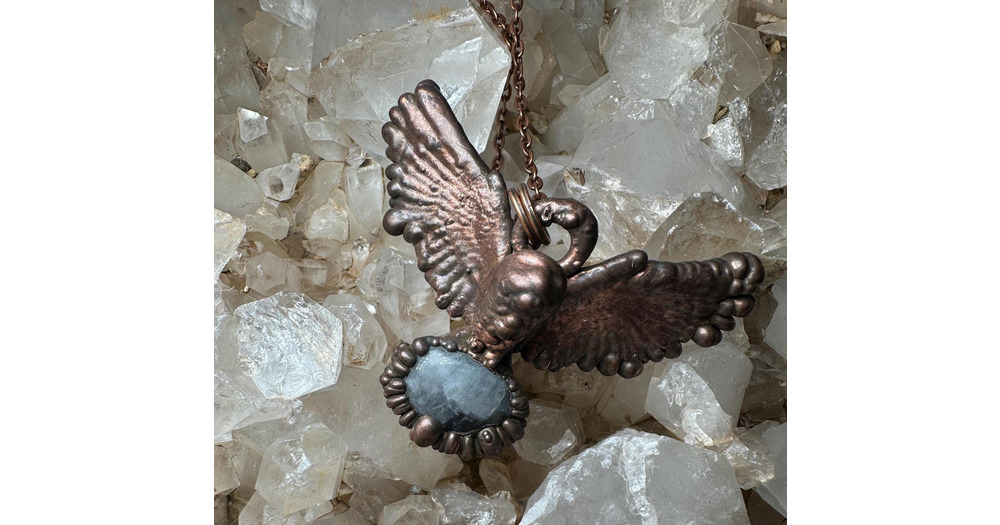 Electroformed Flying Owl Pendant | 3D Printed Copper Owl with Moonstone Gemstone | Owl Gift | Forest