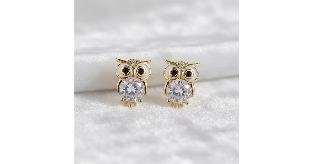 Diamond Owl Stud Earrings, Gold Studs for Women, Black Diamond Owl Earrings, Animal Jewelry Gift, Un
