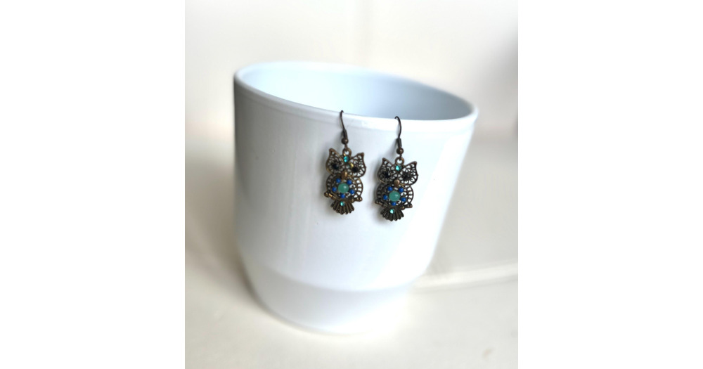 Filigree Owl Shaped Brass and Blue Colour Various Materials Cabochons Vintage Boho Style Dangle Drop