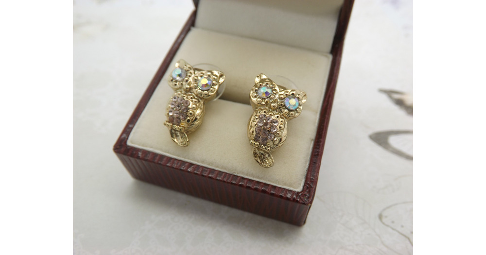 A super fun pair of sitting owl costume jewelry pierced earrings made in shiny goldtone  metal set w