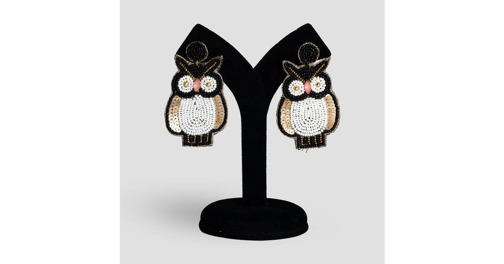Hand Beaded Owl Dangle Earrings: Black & White Boho Jewelry