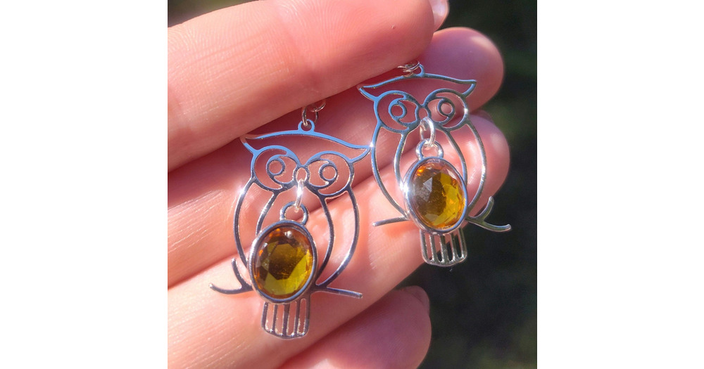 Silver and orange owl earrings