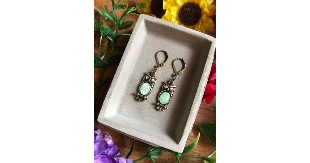 Owl Earrings: Bronze & Rhinestone Iridescent Jewelry