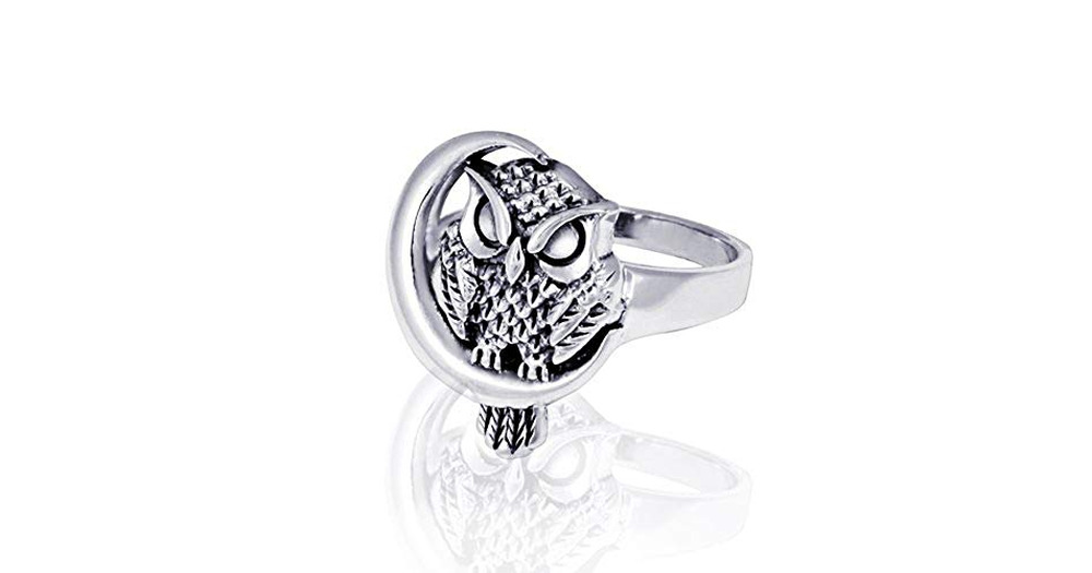 925 Sterling Silver Plated Owl with Crescent Moon Women's Ring (8)
