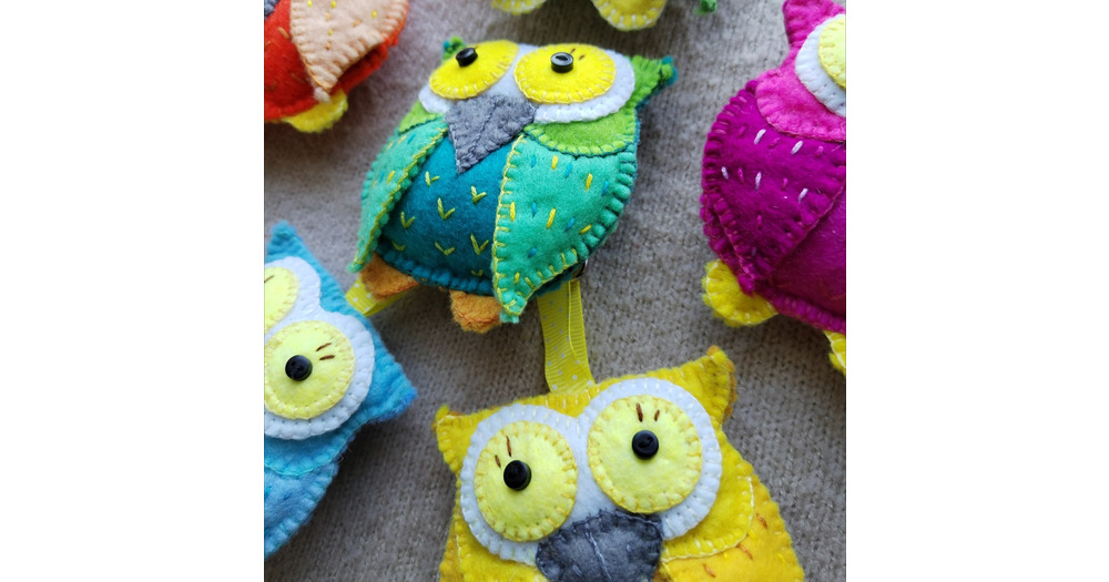 Wonderful felt owl keyrings with lovely embroidery and applique decoration and tiny buttons .