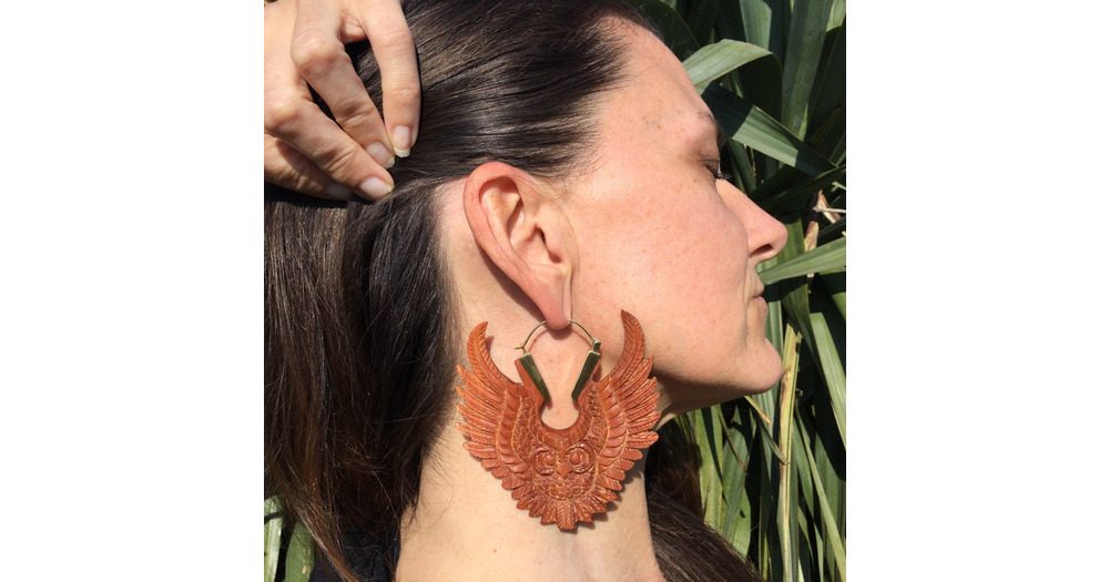 Wise Owl Extra Large Sawo Wood and Brass Earrings - Hand Carved - Unique - Bohemian - Tribal - Mythi